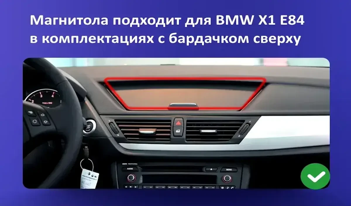 Подходит для BMW X1 E84 2009-2014 только в комплектации без штатного CIC экрана (бардачок "хлебница" сверху). Аудио-система и FM-радио работает напрямую с Андроида, без искажений звука. Поддерживаются полностью кнопки мультируля, отображение климата, парктроников, и бортовой информации.