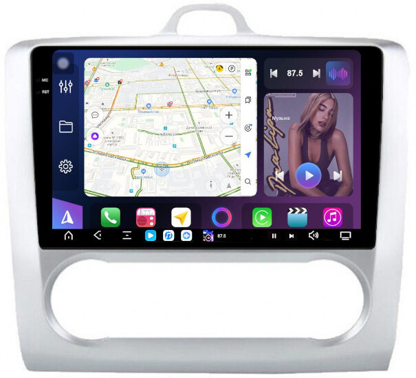 Магнитола для Ford Focus 2 2004-2011 (климат, рамка серебро) - FarCar GX003M монитор 9.5" 2K QLED на Android 14, TS20, 6+128Гб, CarPlay, 4G SIM-слот
