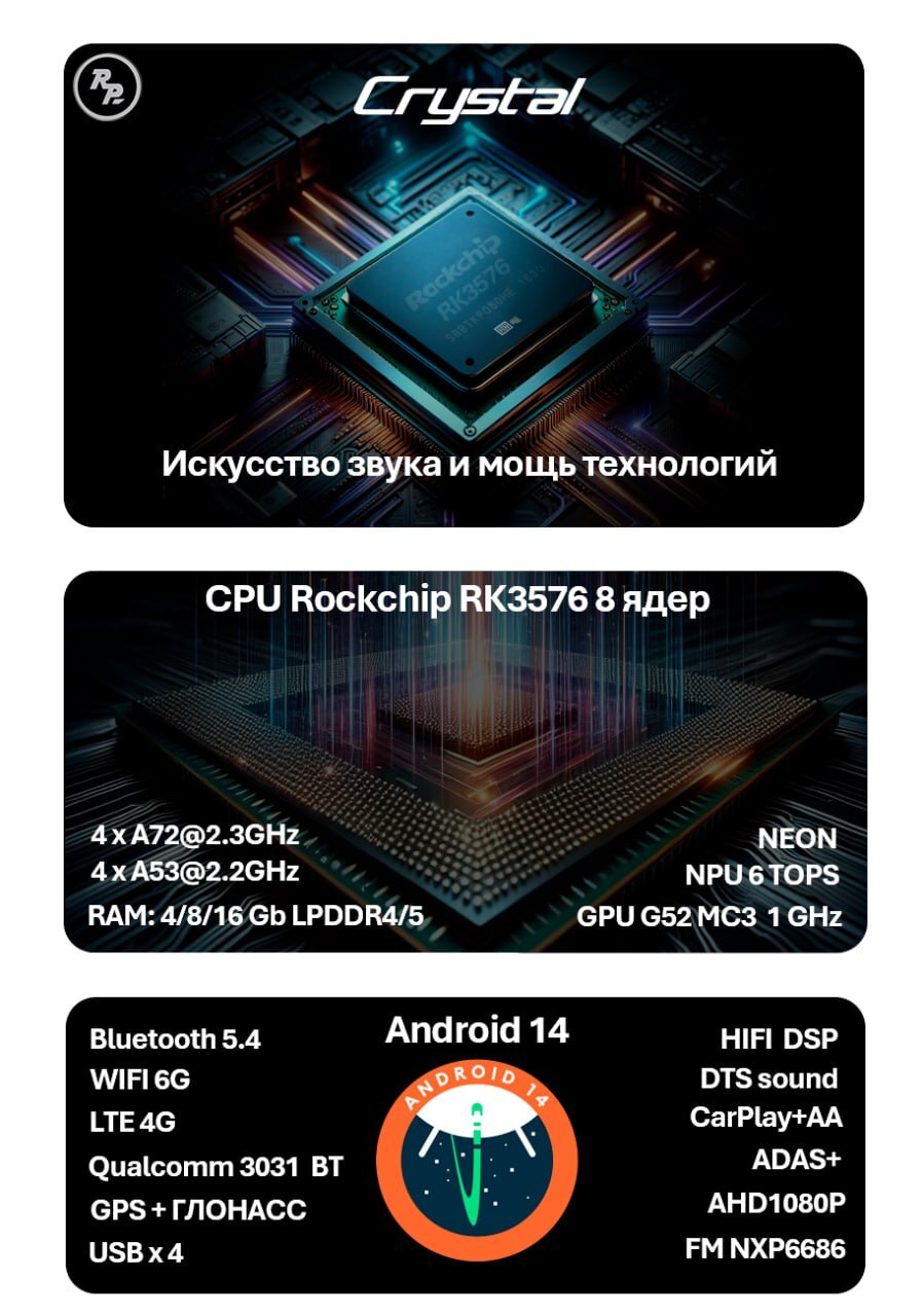 Процессор | Процессор Rockchip RK3576 имеет 100% быстродействия от комфортного для автомагнитол. Полная загрузка обычно занимает около 20-30 секунд, а выход из режима сна - мгновенно! |