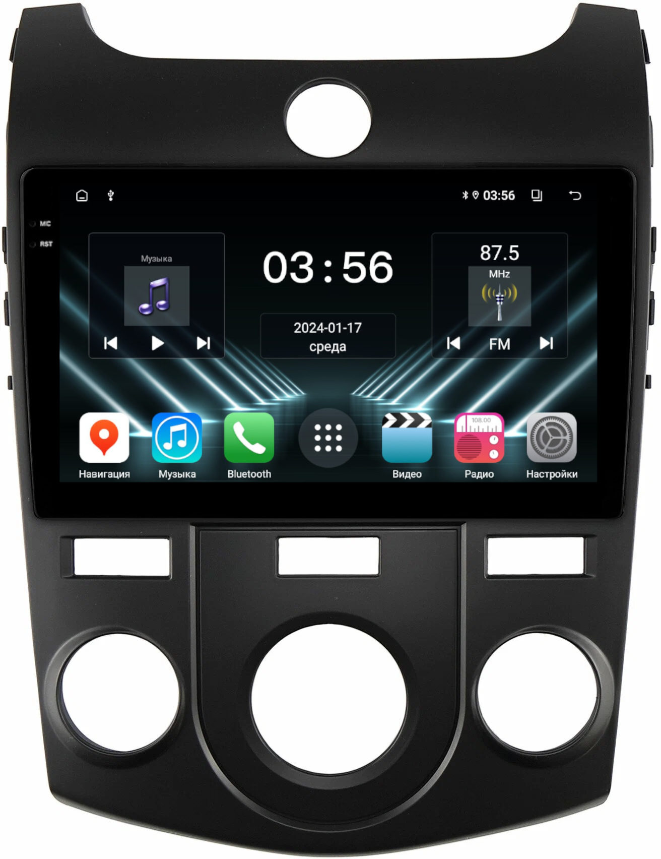Магнитола для KIA Cerato 2 2008-2013 (кондиционер, рамка черная) - FarCar DX038M монитор 9.5" IPS на Android 13, 4+64Гб, CarPlay