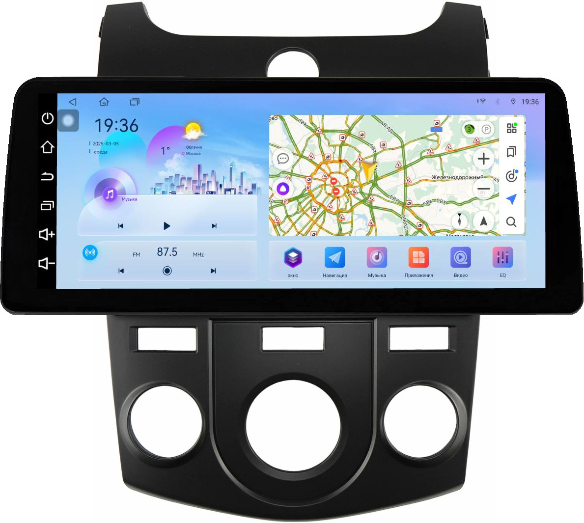 Магнитола для KIA Cerato 2 2008-2013 (кондиционер, рамка черная) - FarCar монитор 12.3" 2K QLED на Android 14, TS10, CarPlay, 4G SIM-слот