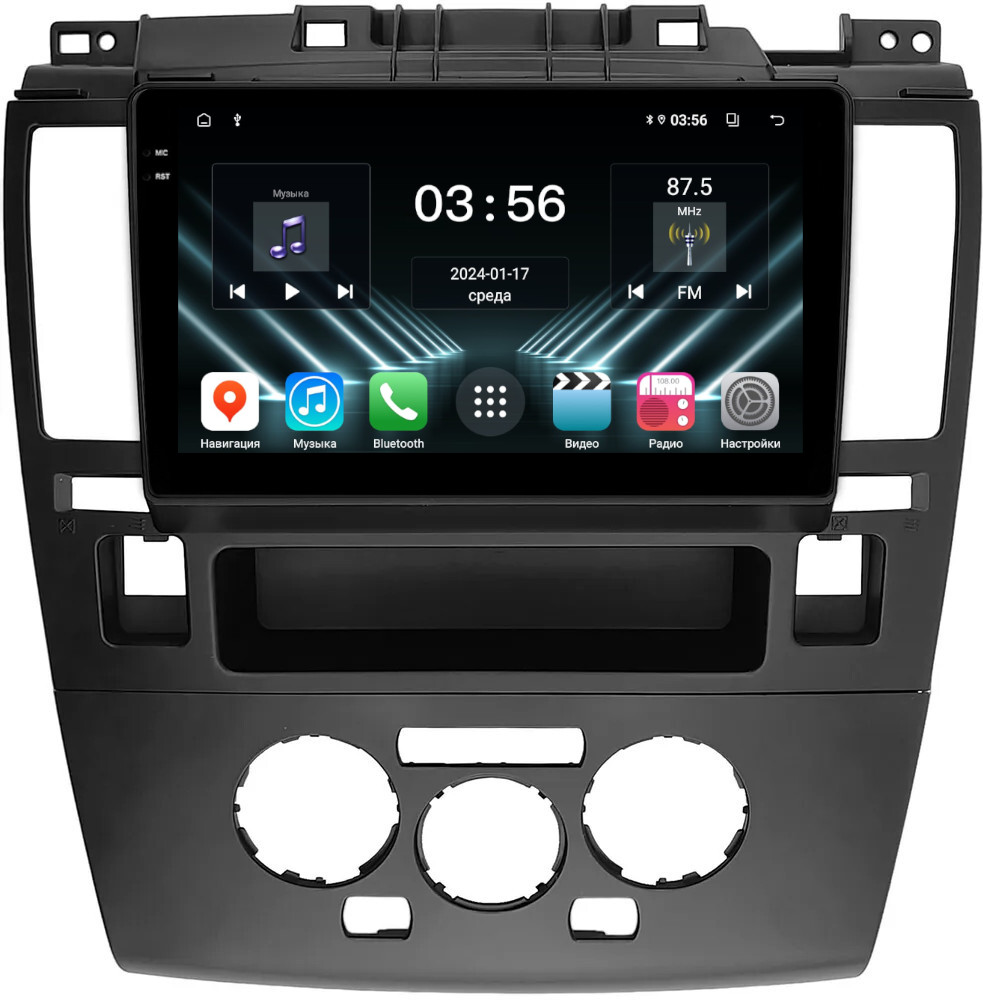 Магнитола для Nissan Tiida C11 2004-2013 (климат с круглым экранчиком, рамка черная) - FarCar DX9-1148CLB монитор 9.5" IPS на Android 13, 4+64Гб, CarPlay