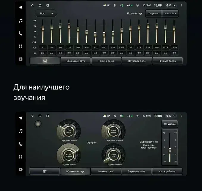 Меню настроек автомобиля (свет, стеклоочистители, климат, поворотники, аудио-система Rockford Fosgate и тд) к сожалению пока на английском, уточняйте обновление ПО.