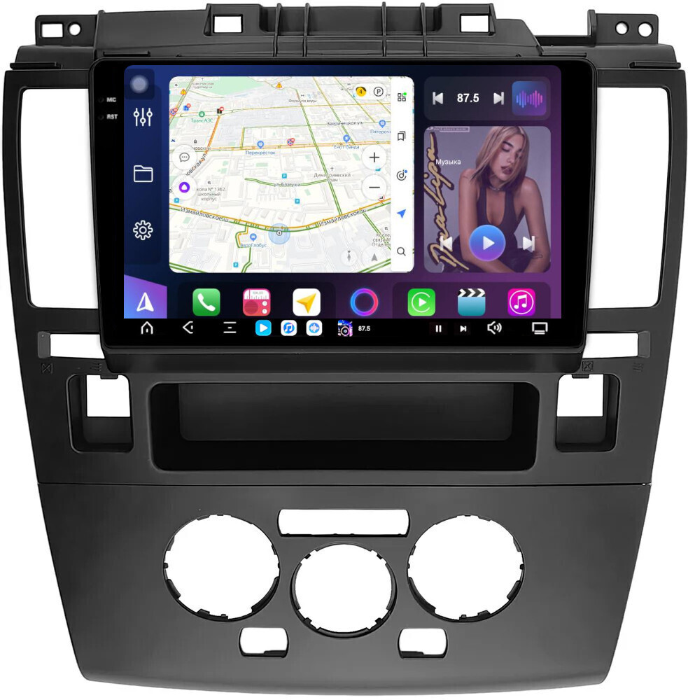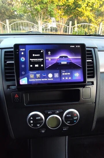 Магнитола для Nissan Tiida C11 2004-2013 (климат с круглым экранчиком, рамка черная) - FarCar GX9-1148CLB монитор 9.5" 2K QLED на Android 14, TS20, 6+128Гб, CarPlay, 4G SIM-слот