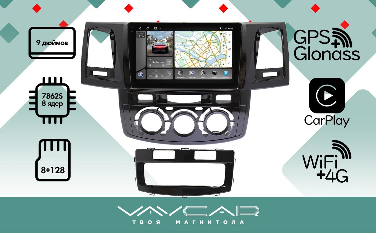 Магнитола для Toyota Hilux 2011-2015 - Vaycar VA77-1143-2K на Android 13, 8-ядер, 2K QLED, ТОП процессор, CarPlay,4G SIM-слот