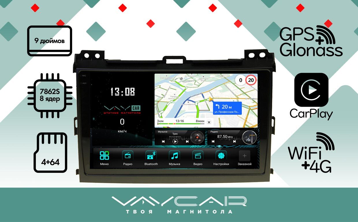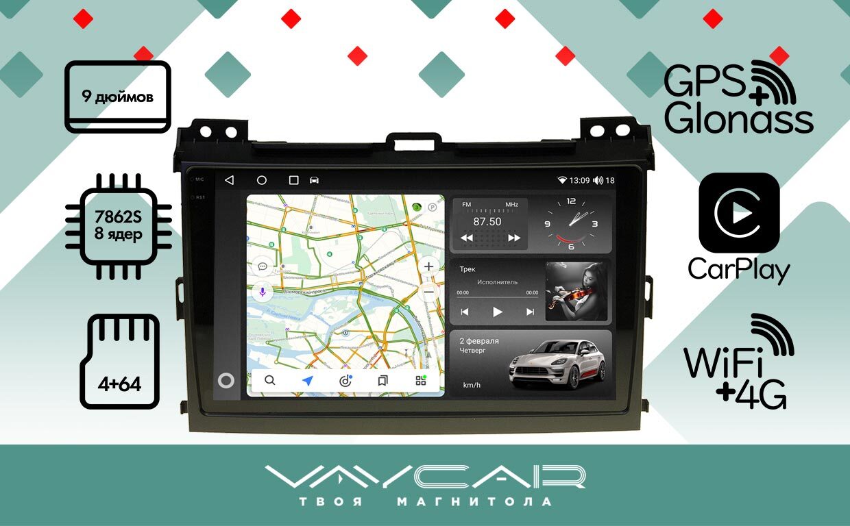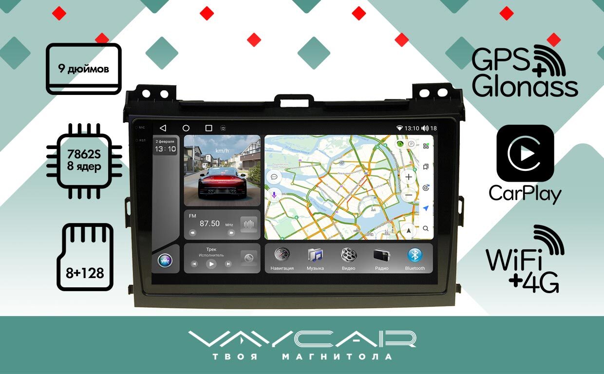 Магнитола для Toyota Land Cruiser Prado 120, Lexus GX470 (экран климата внизу) - Vaycar VA77-0456-2K на Android 13, 8-ядер, 2K QLED, ТОП процессор, CarPlay,4G SIM-слот