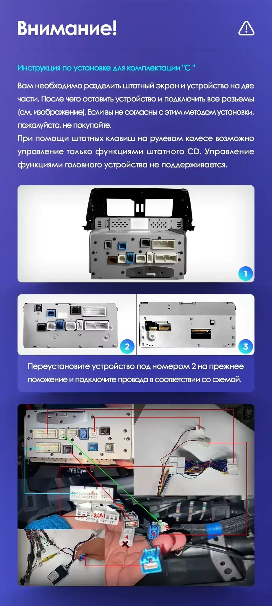 Внимание! Если у вас в комплектации штатная камера заднего вида и вы планируете её подключать (советуем заменить её на нашу новую AHD 1080p камеру) или заводской круговой обзор (4 камеры), то для их подключения требуется ещё приобрести адаптер LVDS-видеосигнала, добавляйте в заказ или уточняйте у наших менеджеров-консультантов.