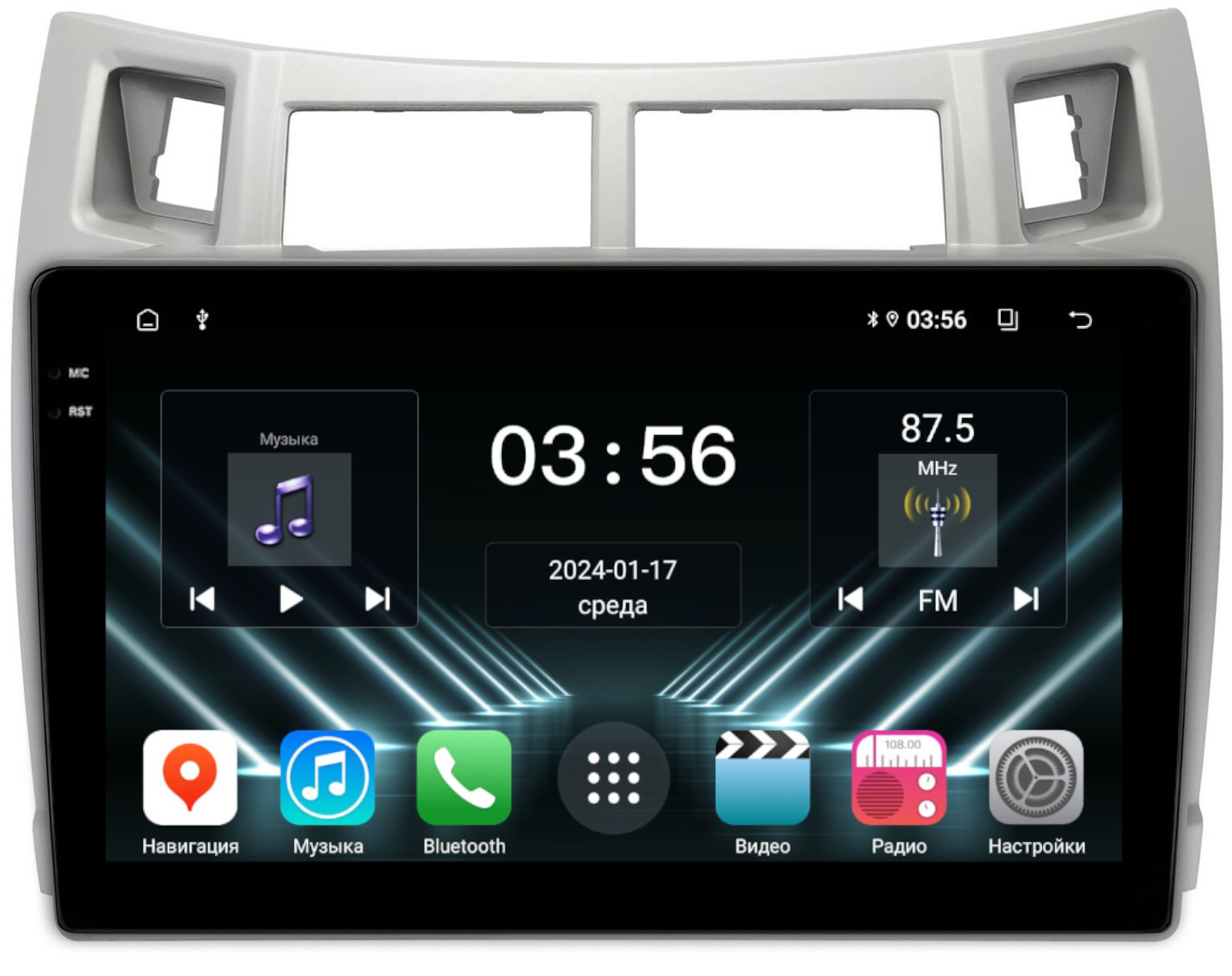 Магнитола для Toyota Vitz 2, Yaris 2 2005-2011 (рамка серебро) - FarCar DX3022M монитор 9.5" IPS на Android 13, 4+64Гб, CarPlay