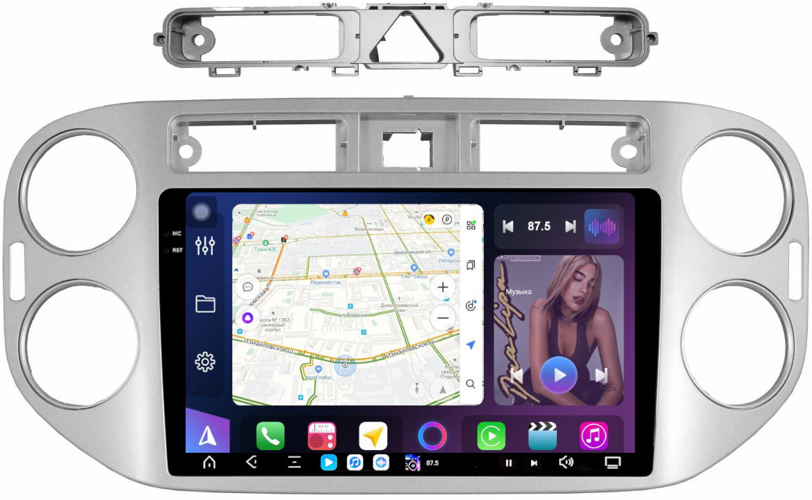 Магнитола для Volkswagen Tiguan 1 2007-2011, Golf Plus (аварийка треугольная, рамка серебро) - FarCar GX489M монитор 9.5" 2K QLED на Android 14, TS20, 6+128Гб, CarPlay, 4G SIM-слот