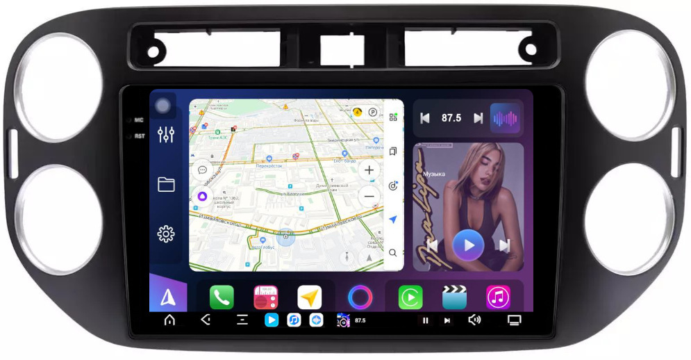Магнитола для Volkswagen Tiguan 1 2011-2016 (рамка 9 чёрная, прямоуг. кнопка) - FarCar GX489M монитор 9.5" 2K QLED на Android 14, TS20, 6+128Гб, CarPlay, 4G SIM-слот
