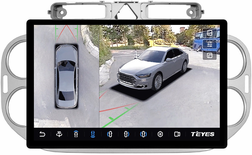 Магнитола для Volkswagen Tiguan 1 2007-2011, Golf Plus (аварийка треугольная, рамка серебро 9) - Teyes CC3-2K-360 монитор 13" 2K QLED на Android 10, 6Гб+128Гб, CarPlay, 4G SIM-слот, 4 камеры в комплекте