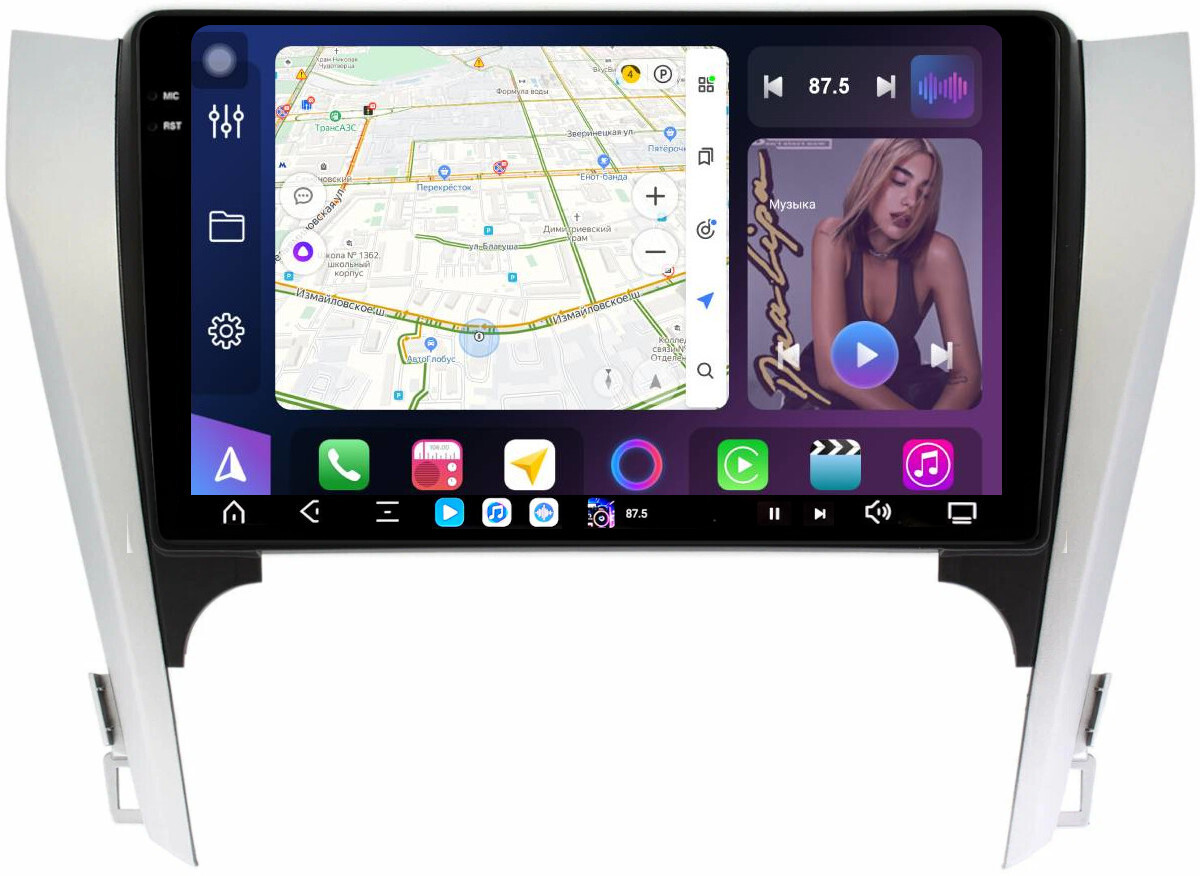 Магнитола Toyota Camry 50 2011-2014 (рамка серебристо-черная) - FarCar GX10-7048B монитор 10.36" 2K QLED на Android 14, TS20, 6+128Гб, CarPlay, 4G SIM-слот