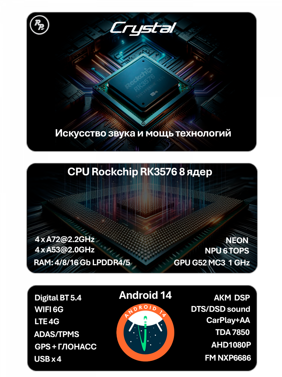 | Процессор | Процессор Rockchip RK3576 имеет 200% быстродействия от комфортного для автомагнитол. Полная загрузка обычно занимает около 20-30 секунд, а выход из режима сна - мгновенно! |